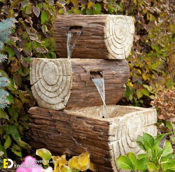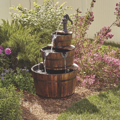 To build this look, use small wooden barrels arranged on a wheel-like structure and place them above a basin that collects the water. The flowing water creates a relaxing sound, making it a wonderful feature for any backyard.