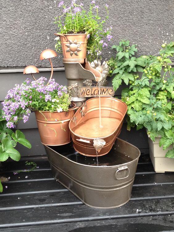 To recreate this feature, you can arrange metal planters and tubs of different sizes, ensuring they are securely positioned for stable water flow. The “Welcome” sign adds a personal, homey touch, making this fountain not only functional but also a decorative piece.