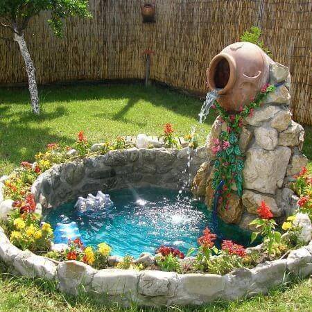 To recreate this, position the pot at a slight angle so the water cascades down smoothly. Surround the fountain with colorful flowers to add life and beauty, and use decorative stones to form the basin.