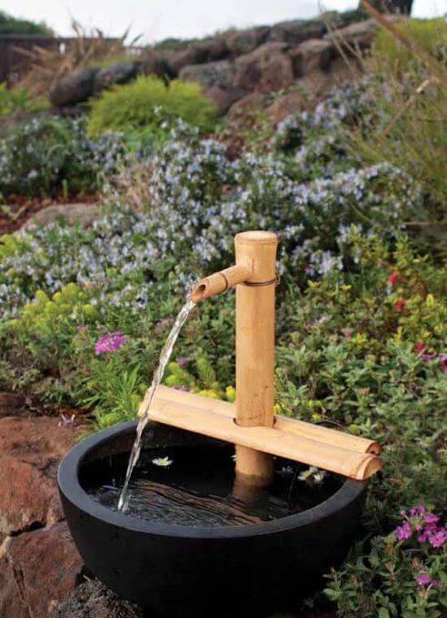 To create this look, simply position a bamboo pole at a slight angle over a bowl or basin, ensuring that the water flows smoothly from the spout. The combination of the natural bamboo and the dark basin creates a beautiful contrast, and adding surrounding flowers or plants enhances the serene vibe.