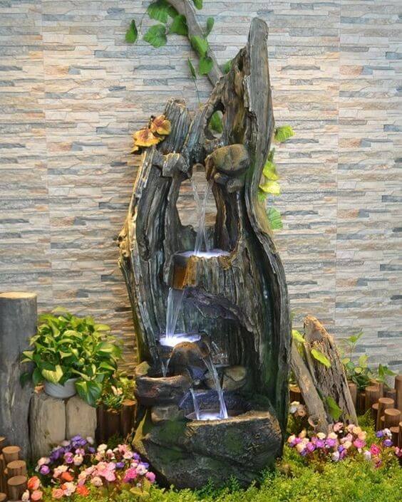 To recreate this design, use a tall, hollowed-out wooden or faux wood structure to form the trunk and position the water to flow from the top down. Add small rocks and pebbles at the base for texture, and surround the fountain with lush plants or flowers to complete the natural look.