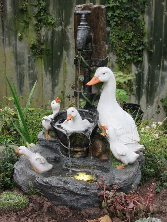 To recreate this design, you can use realistic duck figurines and place them around a small water basin, ensuring that the water flows smoothly between them. The addition of the pump adds a rustic touch, while the soft trickling water creates a peaceful atmosphere.