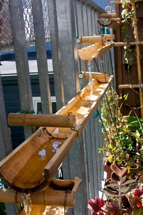 To recreate this look, mount bamboo tubes along a fence or wall, ensuring they are securely attached and tilted slightly to allow smooth water flow. The bamboo’s natural color and texture add a rustic charm, while the trickling water creates a calming, zen-like atmosphere.