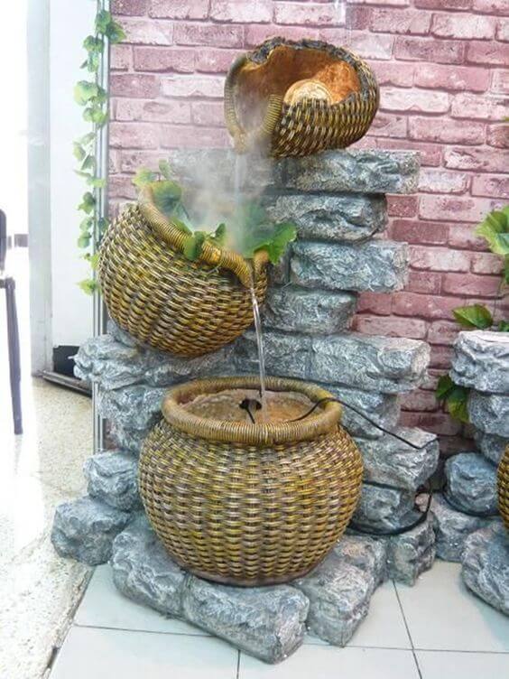 To recreate this, stack several large wicker baskets, positioning them securely so that the water cascades smoothly between each one. Surround the base with stone or faux stone for a natural look, and add plants around the baskets to enhance the earthy vibe.