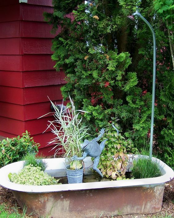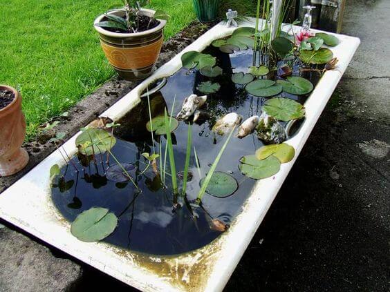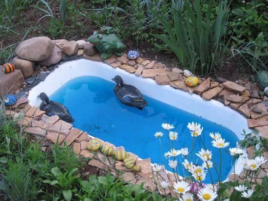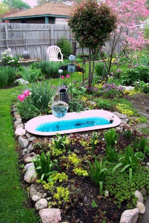 For a simple pond idea, place your bathtub in the ground or partially bury it. Fill it with water, stones, and floating plants. You can add goldfish or guppies for life and movement.