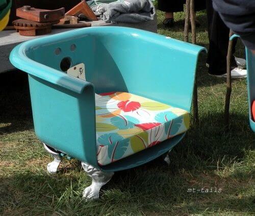 Cut one side of an old clawfoot tub to make a vintage-style outdoor chair. Smooth the edges and add cushions for comfort. Paint the exterior in pastel shades or metallic tones.