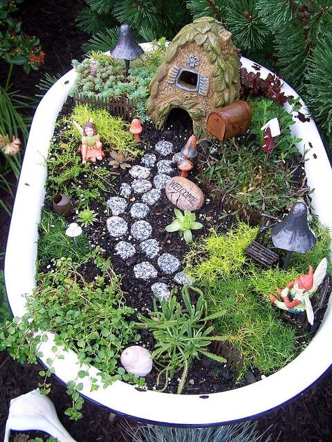 Turn your bathtub into a magical fairy landscape full of imagination. Use small figurines, pebbles, moss, and miniature furniture.