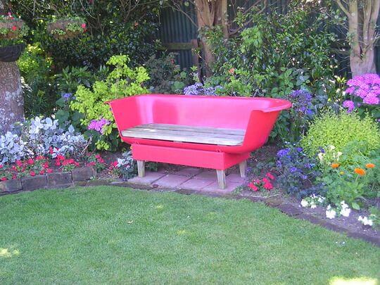An old tub can be reimagined into a one-of-a-kind garden bench. Cut one side open and fit a wooden seat across the top.
