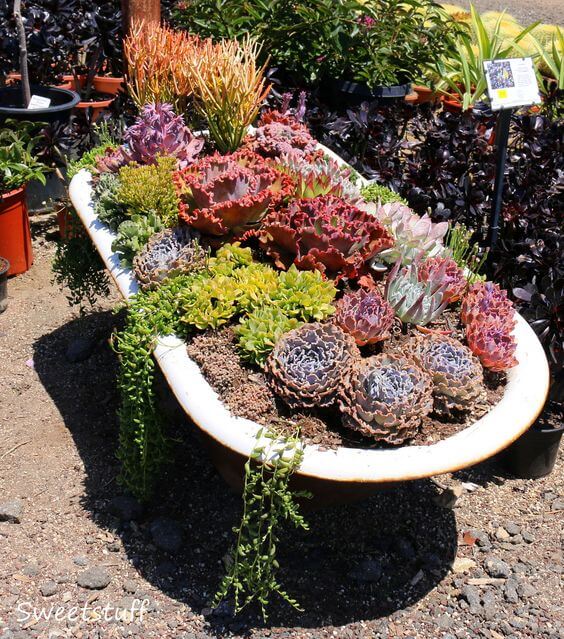 Succulents love shallow containers, making an old bathtub a perfect home for them. Fill it with a layer of gravel for drainage and a sandy soil mix. Arrange different shapes and colors of succulents to create contrast.