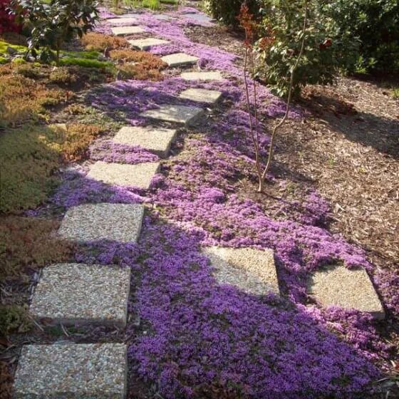 Creeping thyme is an ideal plant for walkways as it forms a fragrant, low-growing ground cover that is dense and durable. Its small pink or purple flowers appear in clusters during the summer and it can also be used in cooking as an herb.