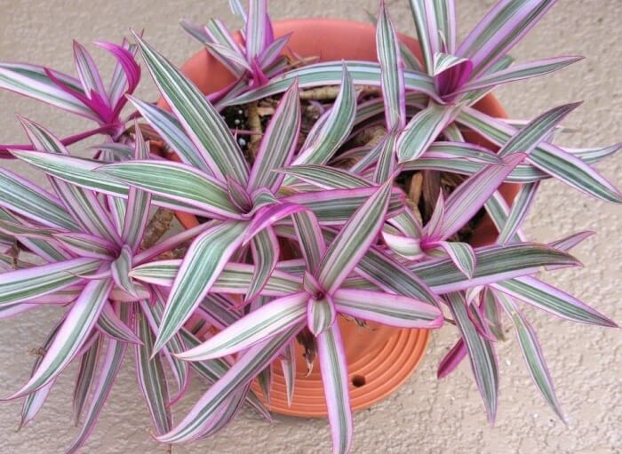 This striking plant has sword-like leaves edged in pink with bold purple undersides that look just as good from below.