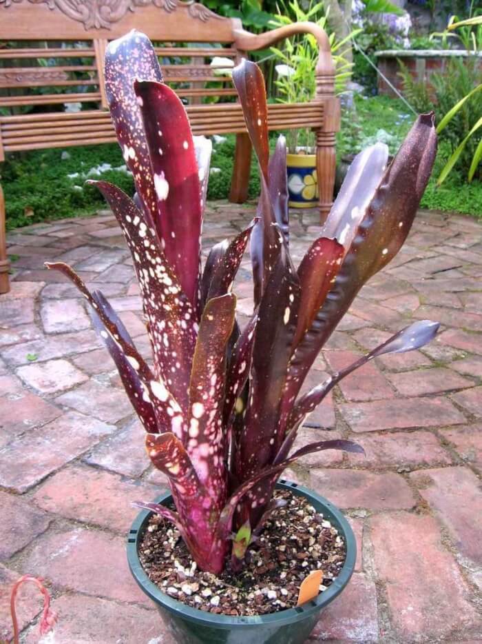 This bromeliad offers tall, narrow leaves with red-green hues and silvery-white speckles. Its upright growth habit and speckled colors make it a bold addition to any indoor plant group.