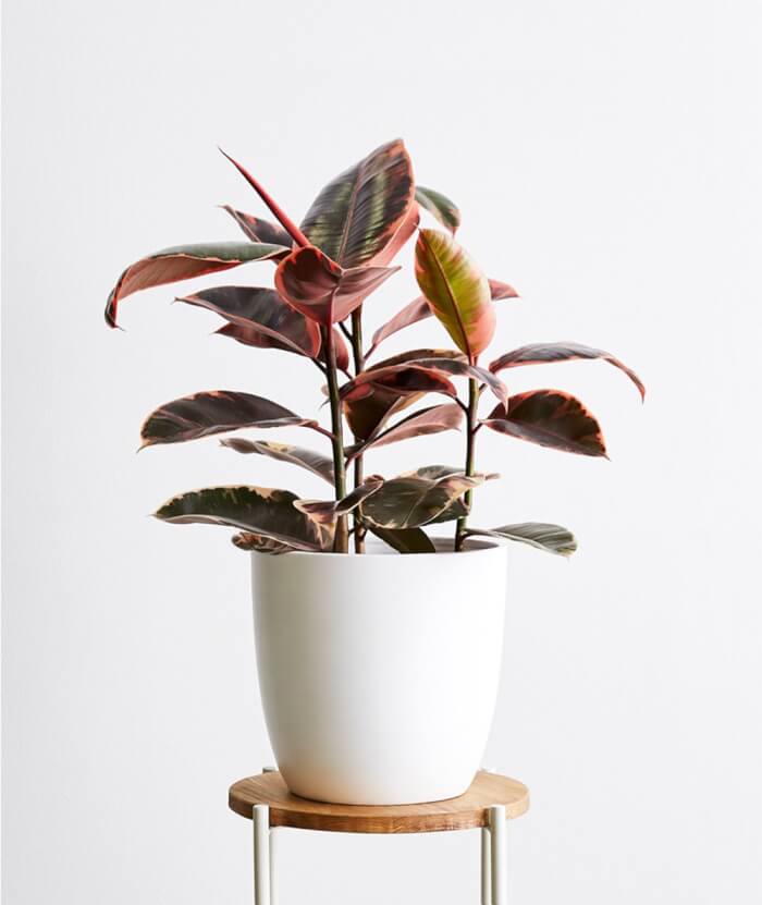 The Pink Rubber Plant blends creamy yellows with dusty pinks on glossy, thick leaves. It feels both exotic and elegant, and its colors shift slightly as new leaves unfurl.