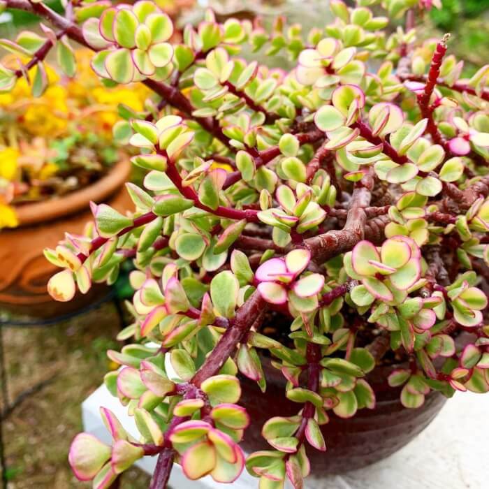 This colorful jade features tiny, plump leaves edged in pink and cream, giving it a cheerful, candy-like appearance. It stays compact and has a playful trailing habit when grown in hanging pots.